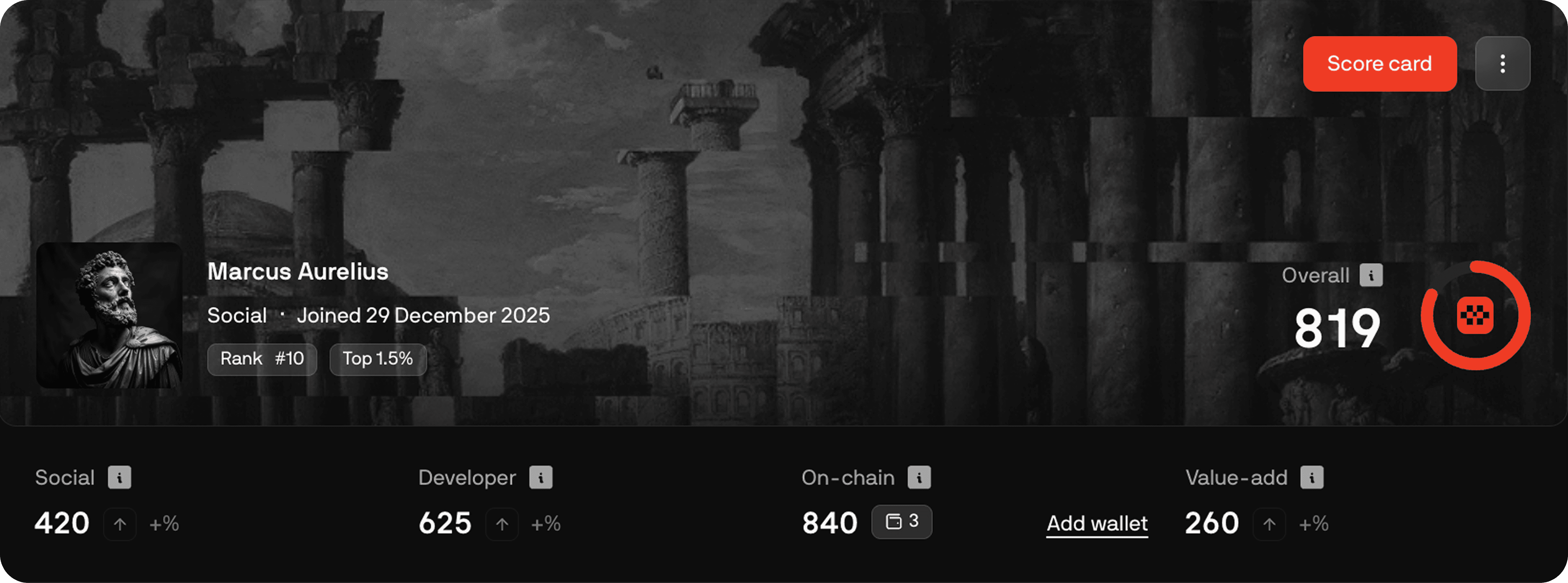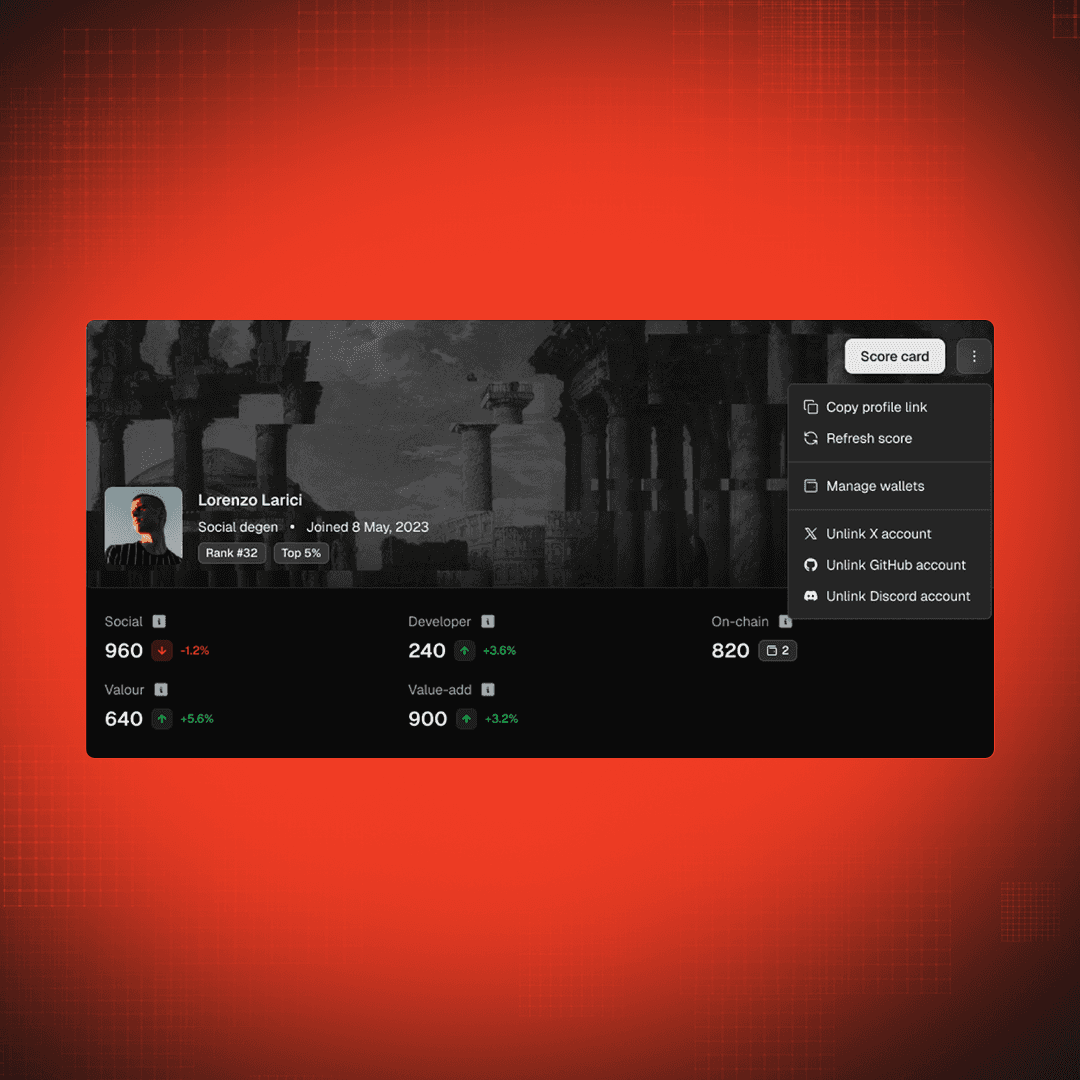 Legion Score measures your reputation across crypto. Onchain activity, wallet history, social presence, community contributions, developer experience.